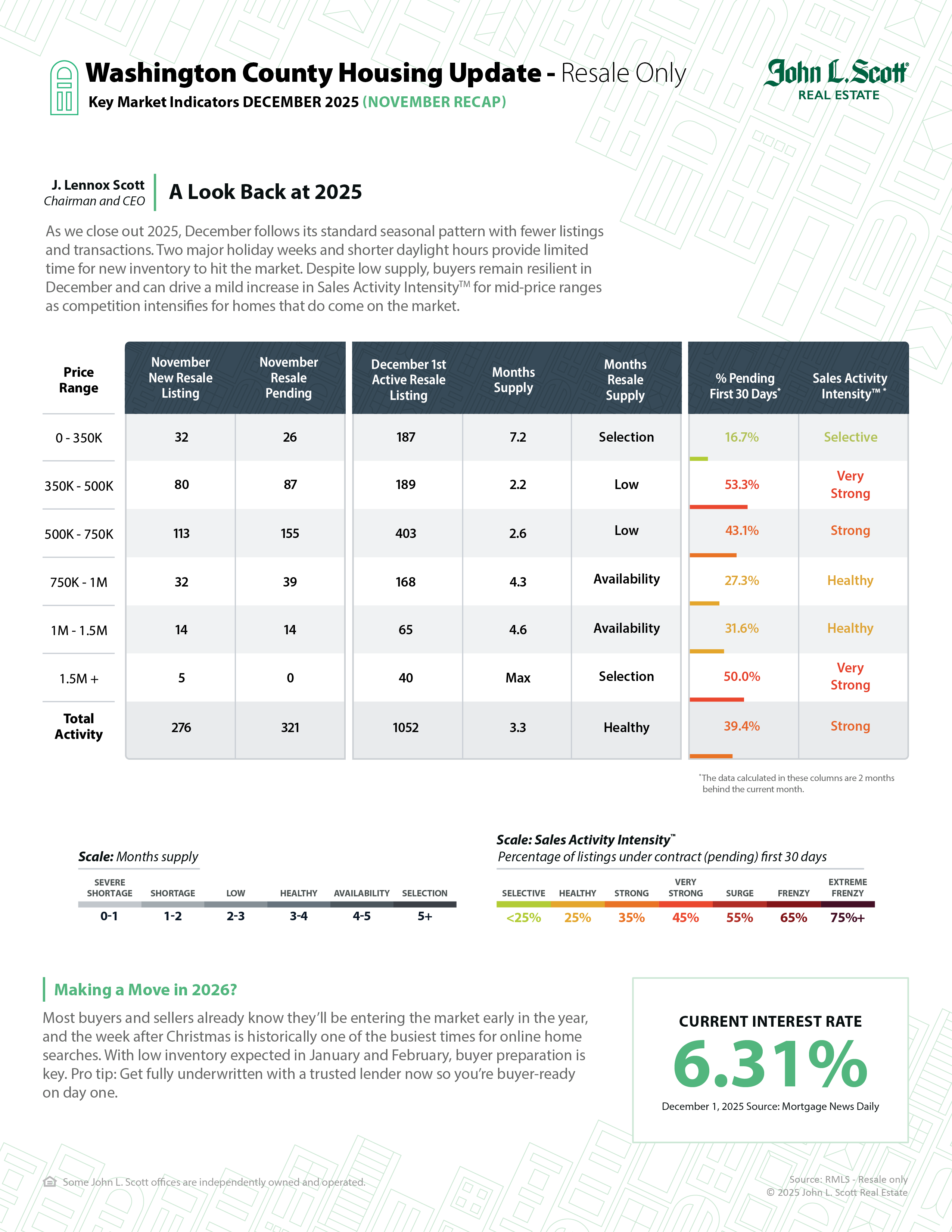 As we close out 2025, December follows its standard seasonal pattern with fewer listings and transactions. Two major holiday weeks and shorter daylight hours provide limited time for new inventory to hit the market. Despite low supply, buyers remain resilient in December and can drive a mild increase in Sales Activity Intensity™ for mid-price ranges as competition intensifies for homes that do come on the market.